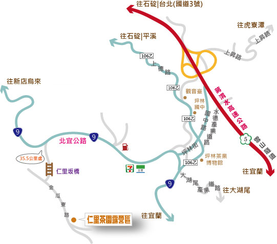 國道三號「坪林交流道」下,循指標往坪林市區方向行駛,接「國中路」直行後接「北宜公路」往新店方向,於35.5公里處左轉進入往金瓜寮方向,過「仁里坂橋」於丁字路口左轉,續行約500公尺左側即可抵達。